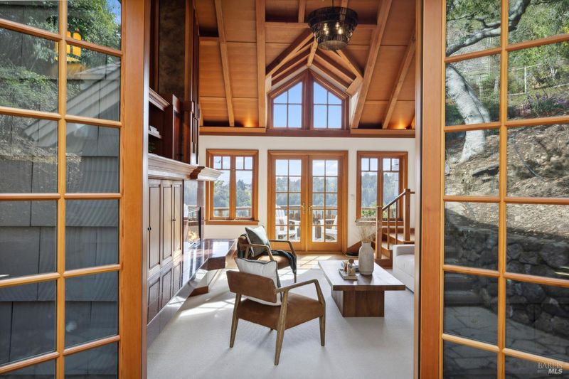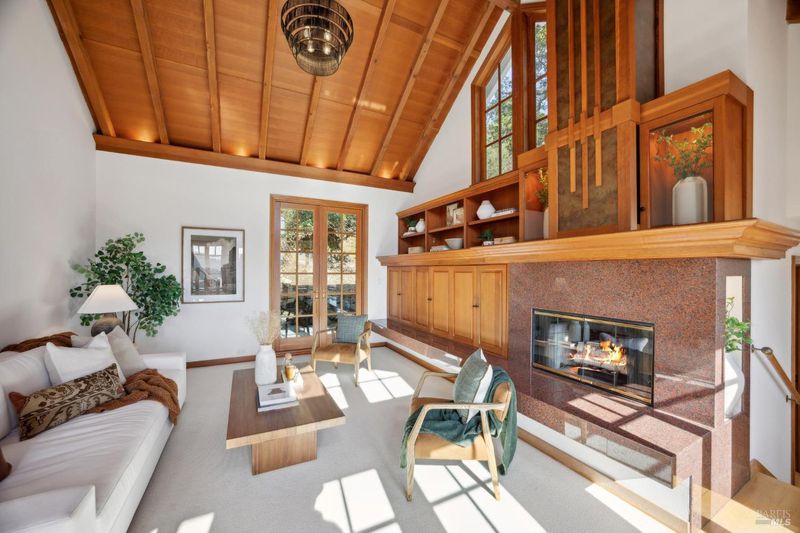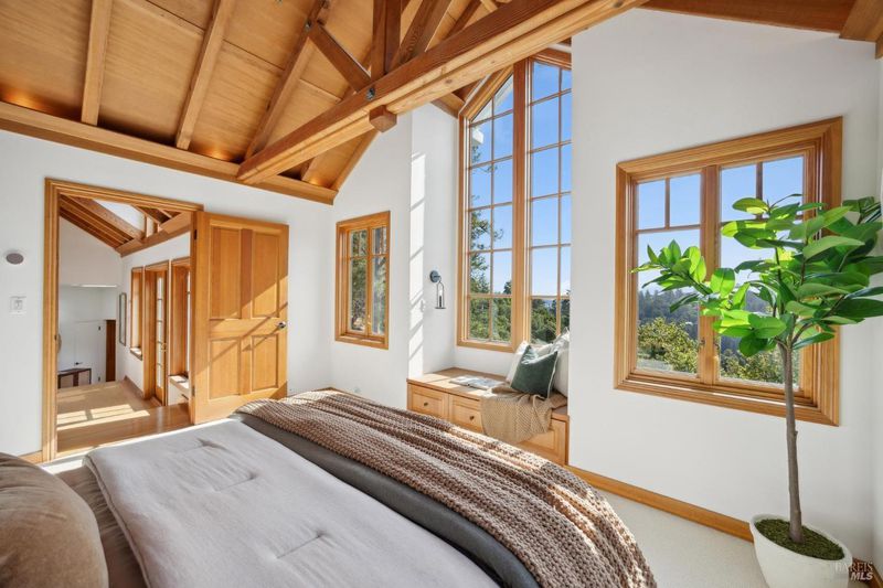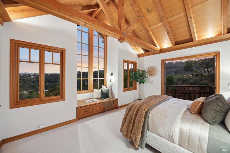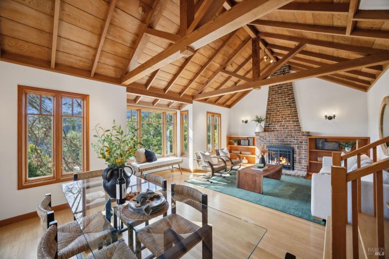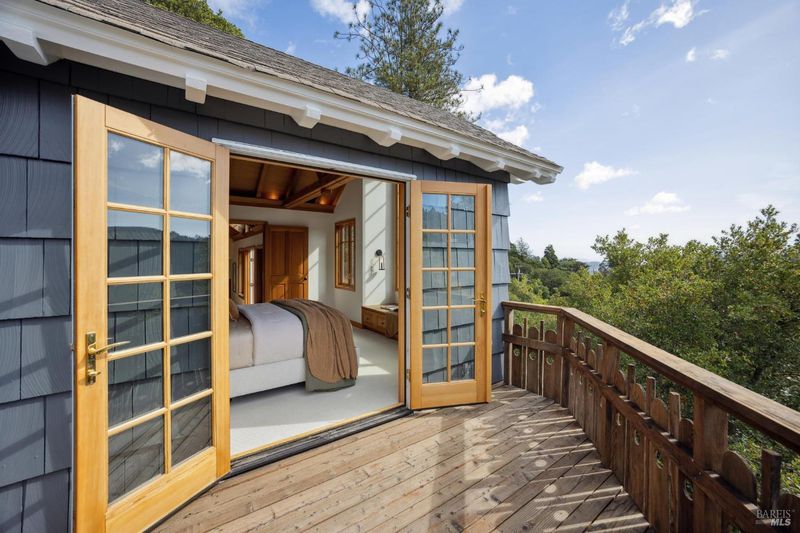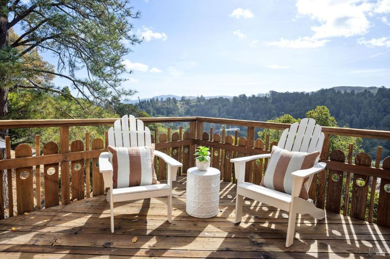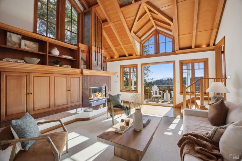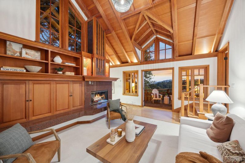 Located in the most desirable sun filled location of spectacular Middle Ridge neighborhood, this dramatic and modernized Craftsman home has sweeping views of San Francisco, the Bay, gorgeous hills. Lovingly expanded and owned by the same family for 49 years, this unique property exudes warmth and charm. Featuring custom vaulted exposed beam timber architecture, built-in cabinetry, a functional layout with 3 bedrooms, 4 full bathrooms, a spacious living/dining room and separate family room both with gas fireplaces. Hardwood oak floors in most rooms with new carpeting in the bedrooms. Large picture windows and multiple french doors from most room lead to inviting outdoor spaces and decks all perfect for taking in the views while relaxing or entertaining. A lower level office or guest room has a full bath and private patio is accessed by a separate entrance. With multiple nearby public Steps, Lanes & Paths, this premier location is a few minutes to downtown, Old Mill Elementary & Old Mill Park, Public Library, Dipsea steps, hiking and biking trails, Mt Tam and more. An expansive backyard features gorgeous mature trees and plantings, a one car garage, and plenty of storage, This home truly is Mill Valley Living at its best.