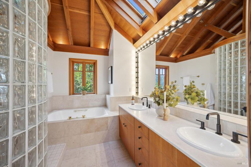 - Double Sinks, Jetted Tub, Marble, Multiple Shower Heads, Shower Stall(s), Tub, Window