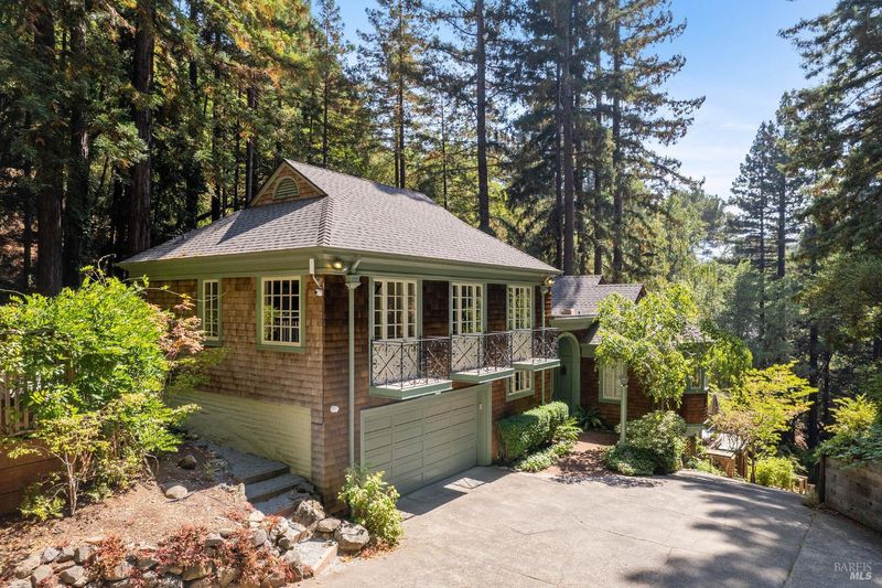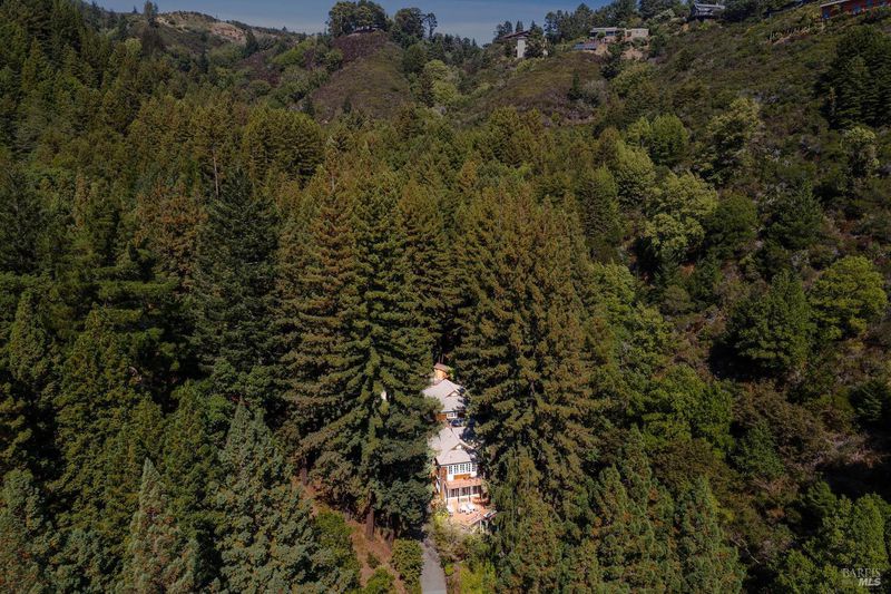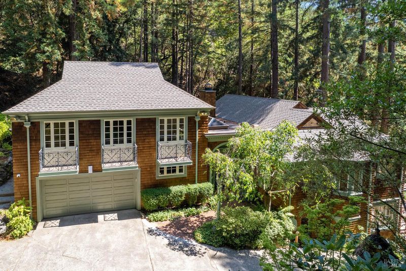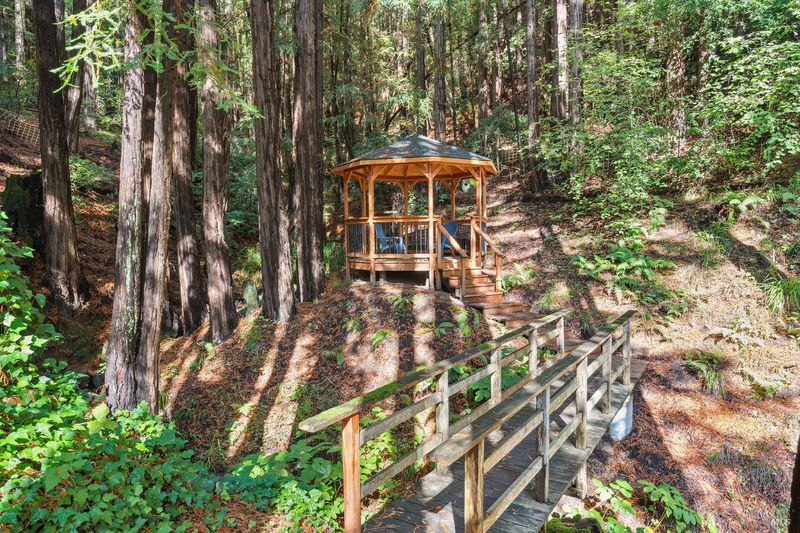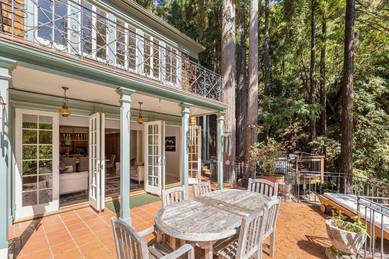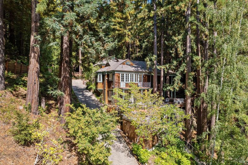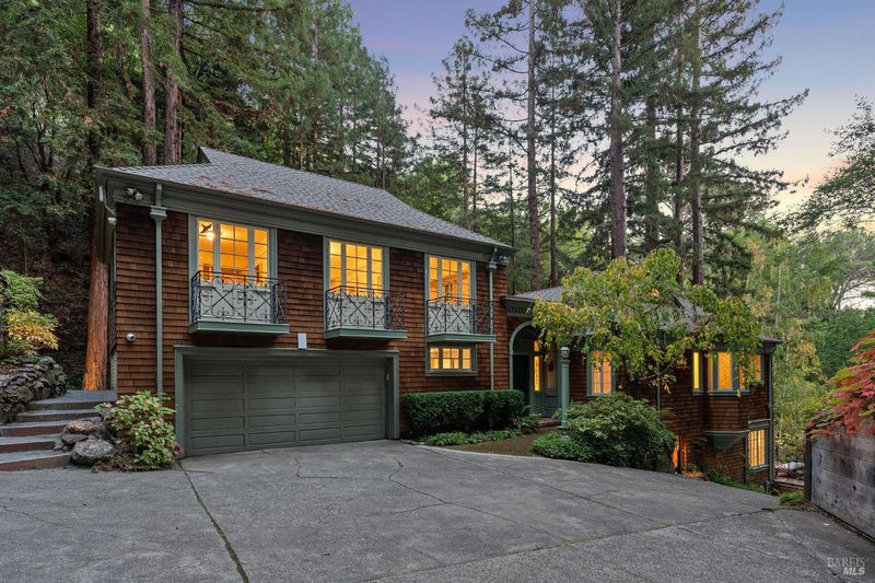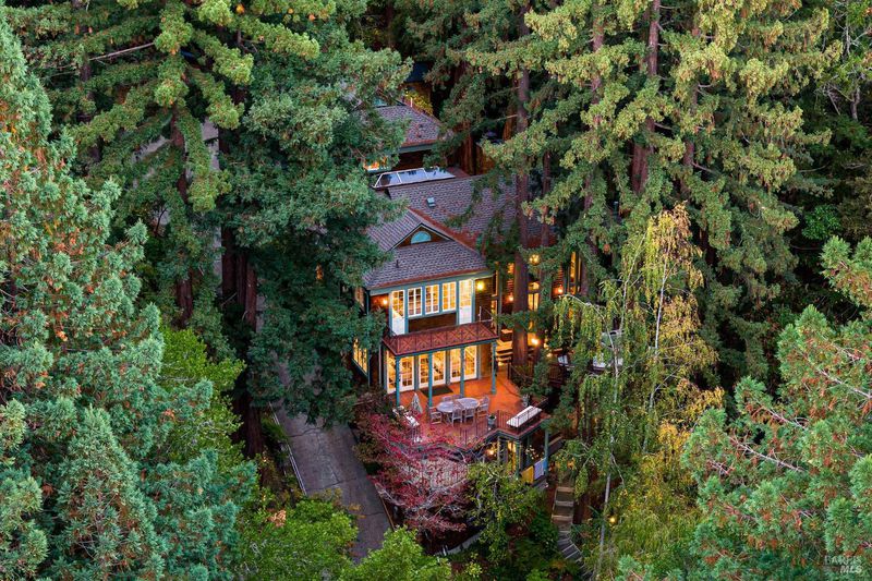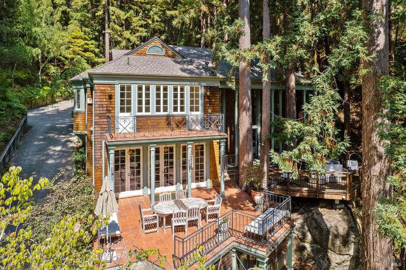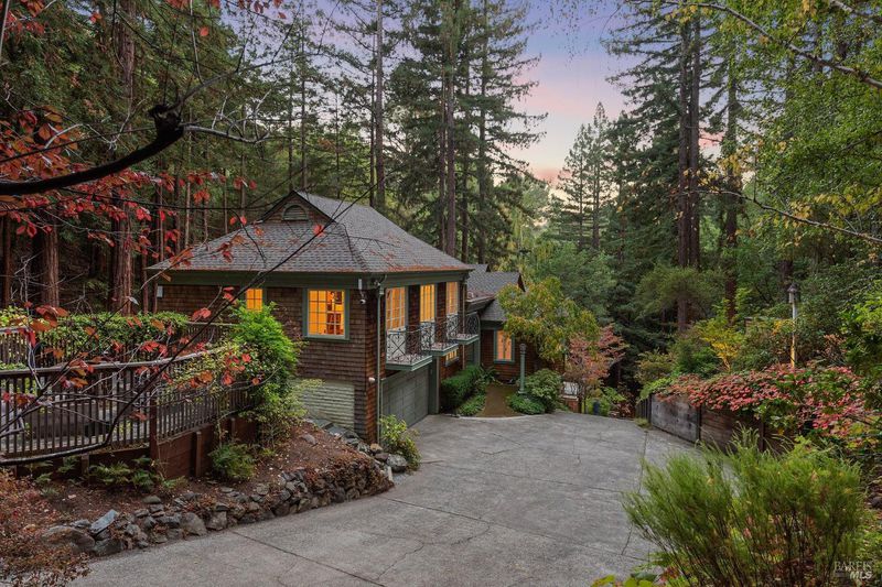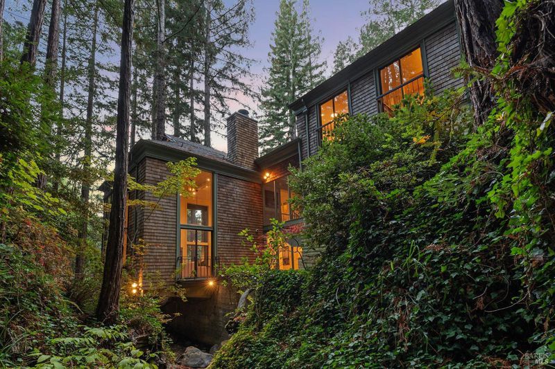 Nestled within the heart of an awe-inspiring Redwood canyon, where a natural waterfall graces the landscape, this extraordinary residence spans 3.4 acres and is a symphony of craftsmanship and the essence of the ultimate Mill Valley experience. The main home is a 4-bedroom, 3-bathroom sanctuary, complemented by an attached ADU and newly installed yurt with full bathroom. The home itself is a testament to architectural wonder - it boasts soaring vaulted ceilings, stained glass windows that cast kaleidoscopic hues, and a 15th Century Venetian carved marble fireplace that stands as a timeless centerpiece. The landscaping has undergone extensive renovations with thoughtful touches including dramatic up lighting, extended exterior WiFi throughout the property, and serene hardscape moments. Enjoy the recently installed hot tub overlooking nature, custom raised garden beds, private gazebo, and multiple outdoor decks among the trees. This property is nothing short of an oasis, a private retreat that evokes the tranquility of a mountain haven. Located near thriving downtown where you'll enjoy acclaimed schools, a plethora of hiking trails, and a lively scene of shops & restaurants. Words and photos cannot fully describe the magic of this special property. You must come see it in person.
